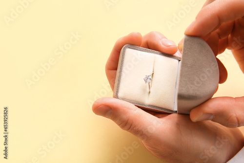 Fototapeta premium Man holding box with engagement ring on beige background, closeup