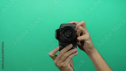 © Krakenimages.com, Naklejka premium Man holding camera against green wall background showcases a close-up of hands handling photographic equipment in an isolated studio setting.
