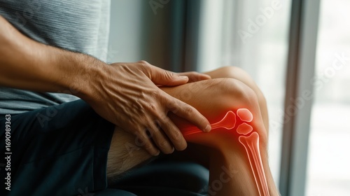 © Sipan, Obraz premium Man holding elbow in pain with digital illustration of joint and bone structure showing elbow pain.
