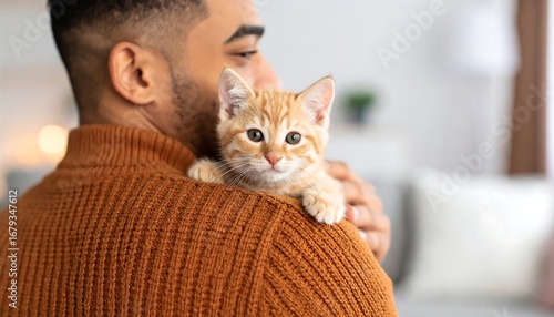 © Trinil, Obraz premium Man holding kitten on shoulder