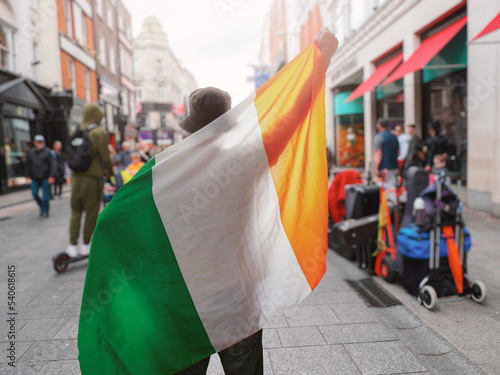 © mark_gusev, Fototapeta premium Man holding National flag of Ireland in focus. Grafton street of Dublin city out of focus in the background. Support or protest concept. Sun flare. Male with Irish flag.