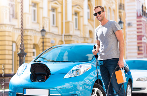 © zinkevych, Fototapeta premium Man holding power cable for hybrid car