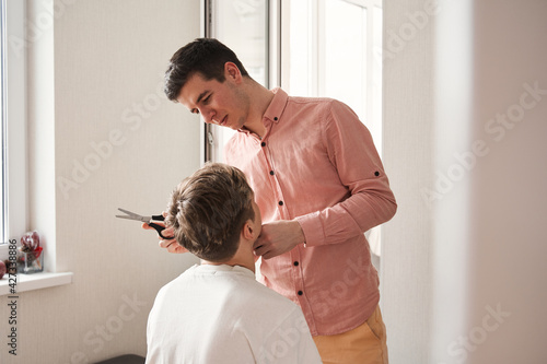 © Yakobchuk Olena, Fototapeta premium Man holding scissors and looking at his boyfriend while cutting his hair
