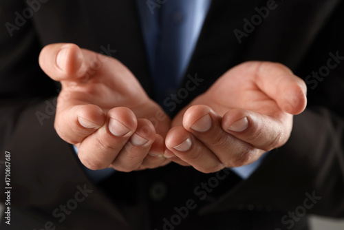 © New Africa, Obraz premium Man holding something on grey background, closeup