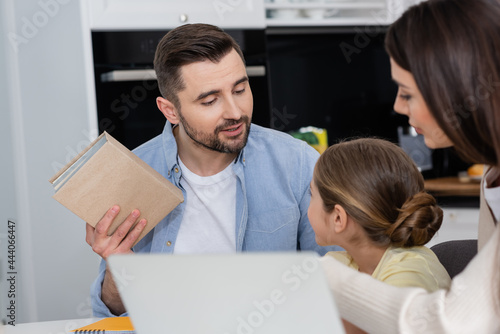 Obraz premium man holding textbook while helping daughter doing homework near wife and blurred laptop