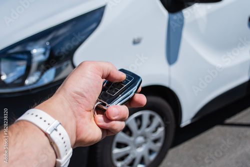 © vadish, Obraz premium Man holds a car key in a parking lot with several cars. The concept of remote car opening and vehicle rental in dealership.