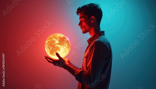 © Vadym, Fototapeta premium Man holds glowing sun in hands. Person with bright solar sphere in studio. Creative concept of power, energy, future or new idea generation.