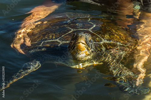 Obraz premium Man holds green sea turtle (Chelonia mydas) by the shell