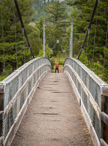 © kellyvandellen, Obraz premium Man Holds up Arms Across Suspension Bridge