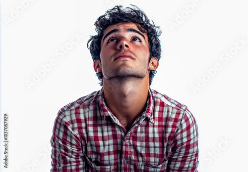 © Azazul, Fototapeta premium Man in a checkered shirt looking up, isolated on a white background.