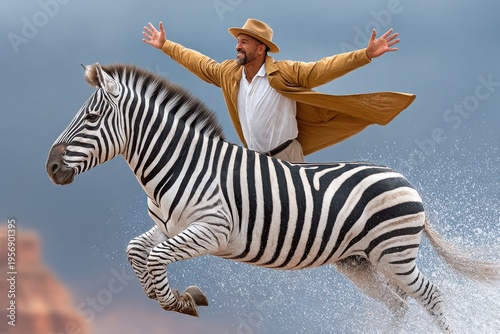 Fototapeta premium Man in a hat rides a zebra at full speed across water spray in a dramatic...
