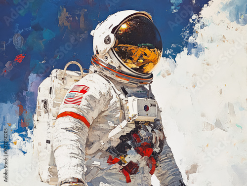 Fototapeta premium Man in a space suit is standing in front of a blue sky. The painting is a...
