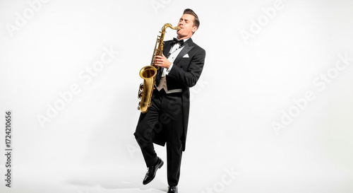 © Marlon, Obraz premium Man in a tailcoat playing saxophone on a white background