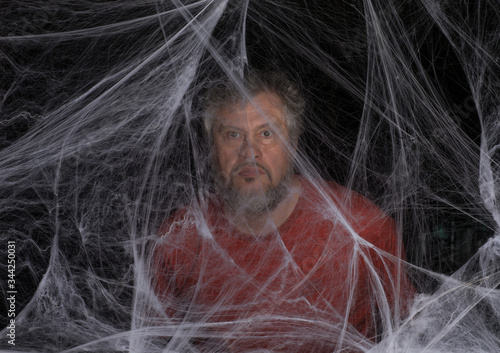© serikbaib, Naklejka premium man in a white spider web on a black background