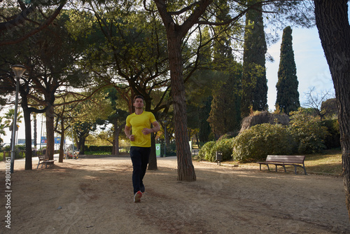 © pablocalvog, Fototapeta premium Man in a yellow shirt running through the trees