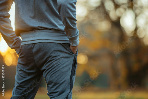 © Derrick, Fototapeta premium Man in Athletic Wear Standing Outdoors with Hands in Pockets During Autumn Sunset