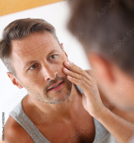 © goodluz, Obraz premium Man in bathroom applying cosmetics on his face