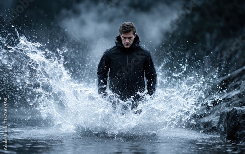 © Aslob, Fototapeta premium Man in black jacket wading through water splashes