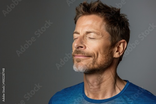 © Vibu design gallery, Obraz premium Man in blue shirt enjoying fresh air with eyes closed.