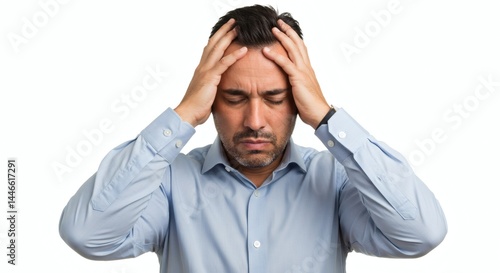 Naklejka premium Man in blue shirt with hands on head looking stressed on a white background...