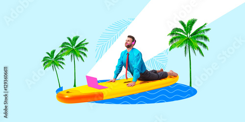 Fototapeta premium Man in business shirt and tie lying on surfboard floating on water, stretching in yoga pose, wearing headset, under palm trees. Concept of relaxation, work-life balance, stress-free remote work.