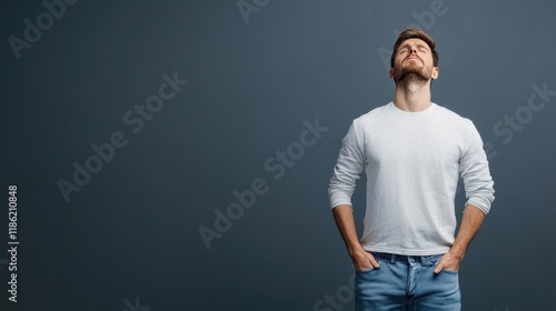 © khonkangrua, Fototapeta premium Man in Casual Attire Gazing Upward with A Thoughtful Expression Against a Simple Gray Background