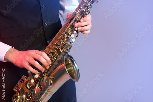 © New Africa, Obraz premium Man in elegant outfit playing saxophone on color background, closeup. Space for text