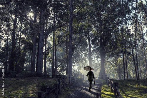 Fototapeta premium Man in foggy forest. Mixed media