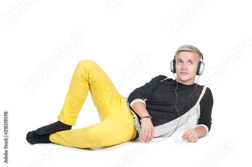 © Canvas Alchemy, Obraz premium Man in headphones lying down