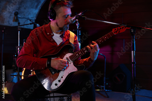© New Africa, Obraz premium Man in headphones playing electric guitar on stage