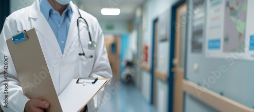 Obraz premium man in lab coat holding clipboard in hospital corridor