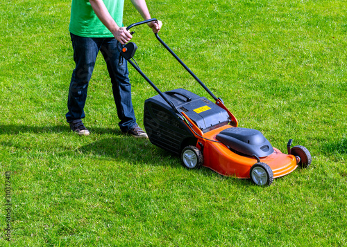 © maxoidos, Fototapeta premium Man in motion with lawnmower and mows green grass