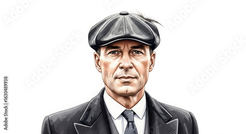 © Nima, Fototapeta premium Man in Newsboy Cap and Suit - Portrait of a man wearing a stylish newsboy cap and suit, serious expression