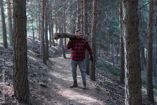 Obraz premium man in plaid shirt picking up a large log in the forest