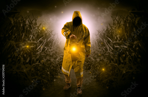 Fototapeta premium Man in raincoat at night coming from thicket and looking something with...