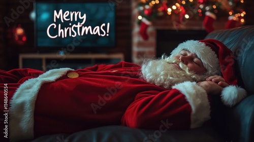 © Hope, Obraz premium Man in Santa Claus costume is sleeping on the sofa opposite the TV is on with the text Merry Christmas!
