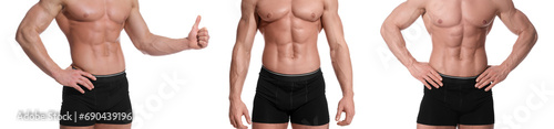 Fototapeta premium Man in stylish black underwear on white background, set of closeup photos