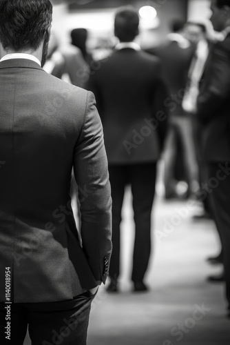 Fototapeta premium Man in suit, backs to camera, blurred crowd.