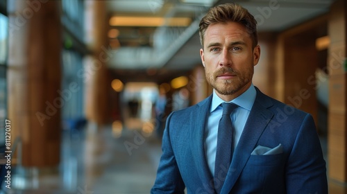 © olegganko, Naklejka premium Man in Suit Sitting in Front of Lecture Hall