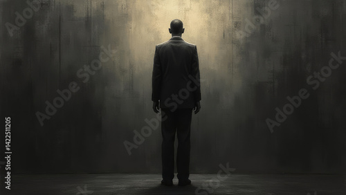Obraz premium man in suit stands in dimly lit room, contemplating