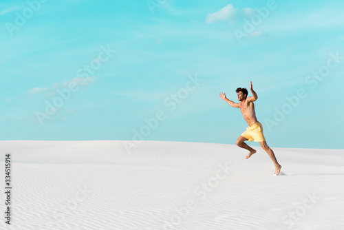 Obraz premium man in swim shorts with muscular torso running on sandy beach
