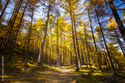 © Luca, Fototapeta premium Man in the middle of a path in a forest of pine trees with autumn colors