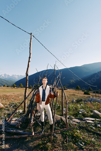 © SHOTPRIME STUDIO, Fototapeta premium Man in traditional clothing stands by a rustic fence in a rural mountain landscape and grassy field under clear sky. Outdoor portrait, countryside lifestyle, scenic nature scene.