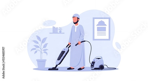 Obraz premium Man in Traditional Clothing Vacuuming Modern Home