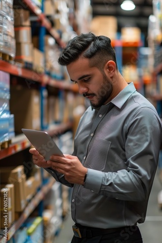 © Jorge Ferreiro, Fototapeta premium Man in Warehouse Looking at Tablet