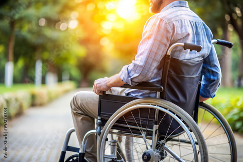 © thanakrit, Obraz premium Man in wheelchair in a park on a sunny day
