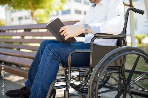 © AntonioDiaz, Fototapeta premium Man in wheelchair reading a book