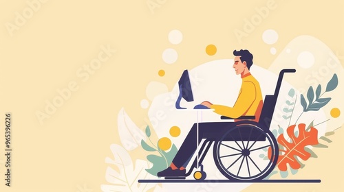 © Natalya, Fototapeta premium Man in wheelchair working at computer, colorful office environment, accessibility, freelance concept