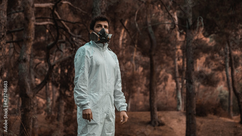 Obraz premium Man in white overalls wearing a gas mask in a post apocalyptic nature