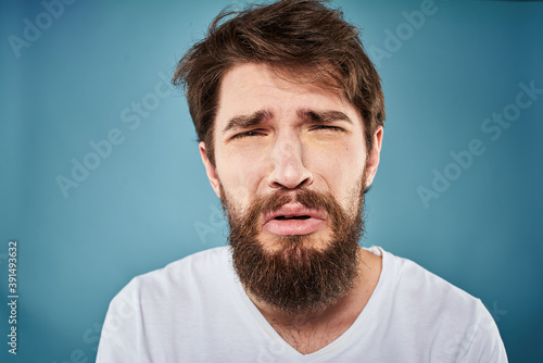 Fototapeta premium Man in white t-shirt lifestyle studio emotions facial expression blue...